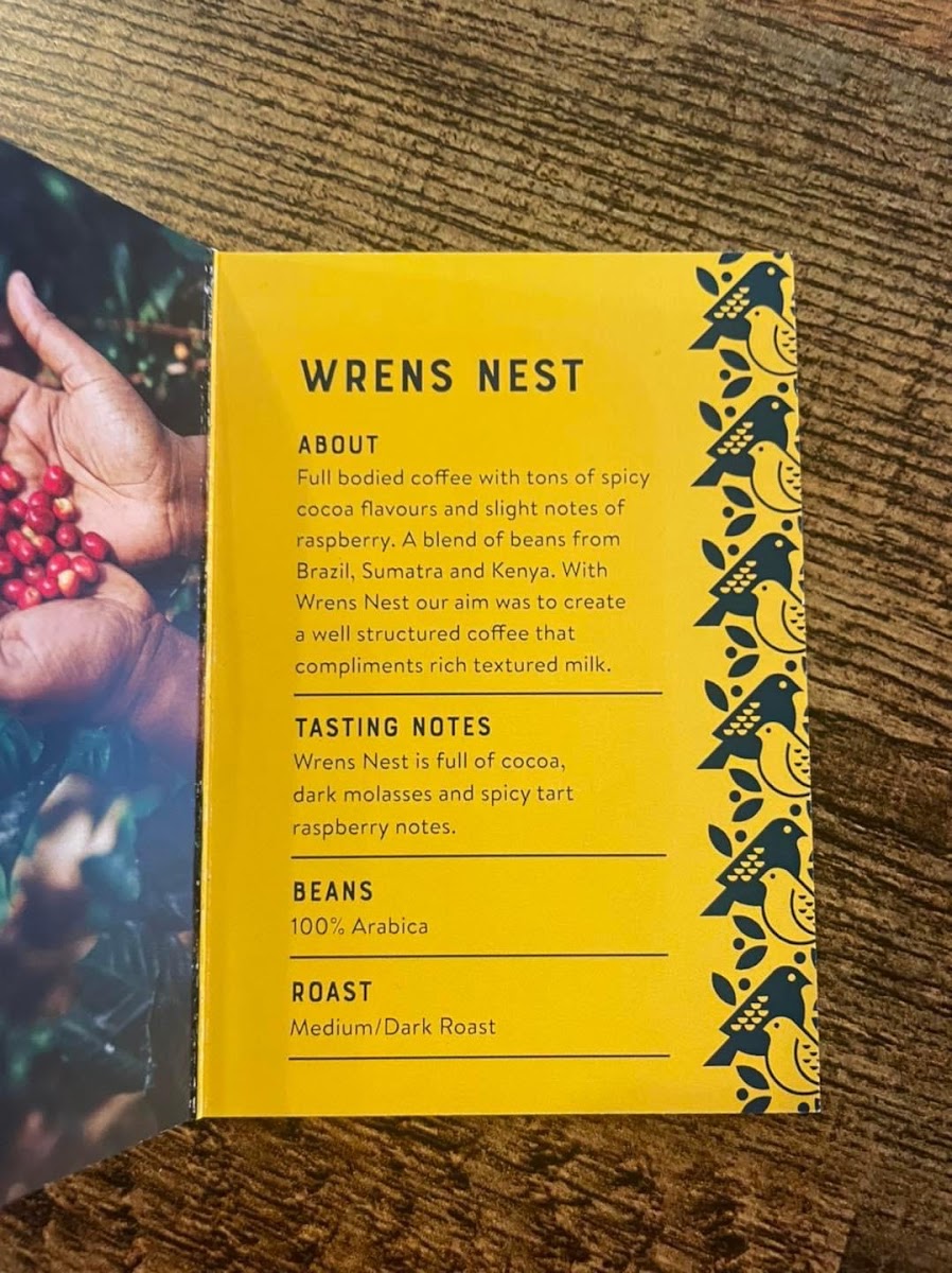 The menu offers a variety of options suitable for breakfast, coffee breaks, and light meals. It features a selection of hot and cold drinks, including different types of coffee, which are also available for purchase by the bag. Food choices include sandwiches, wraps such as the Sweet Chilli Chicken Wrap, and cakes for dessert or snacks.